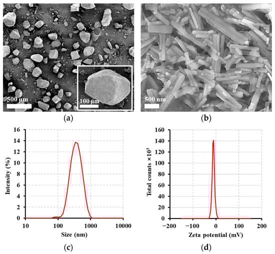 SEM observations revealed marked differences in the morphology between the DTS raw material and DTS-NS. The raw material exhibited rhombohedral shapes with diameters of 102–352 µm (Figure 4a). However, the particle size markedly decreased after bead milling, accompanied by a change in the morphology to rod-shaped crystals (Figure 4b). The particle size of DTS-NS was determined to be 324 nm (Figure 4c), with a zeta potential value of −11.1 mV (Figure 4d). The size of DTS-NS was within the size range of commercialized LAI drug suspensions. The mean crystal sizes of paliperidone palmitate (Invega Sustenna®, Janssen, NJ, USA), aripiprazole (Abilify Maintena®, Otsuka Pharmaceutical Inc., Tokyo, Japan), olanzapine (Zyprexa Relprevv®, Eli Lilly, Indianapolis, IN, USA), and rilpivirine suspensions (Cabenuva®, ViiV Healthcare, London, UK) have been reported to be <1 µm [39], 1–10 µm [40], 1–13 µm [41], and <0.5 µm [42], respectively. The optimized DTS-NS system was physicochemically stable, maintaining its drug content, particle size, and uniformity over 4 weeks at 25 °C (Table S1).