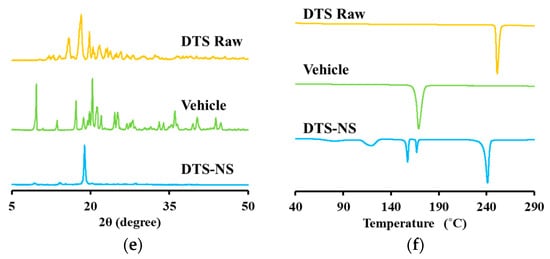 The solid-state crystallinity of DTS in the NS formula was further evaluated using XRD and DSC. The solid-state crystallinity of DTS in the NS formula was evaluated using XRD and DSC. The XRD pattern of the DTS raw material showed characteristic peaks at 15.8°, 18.2°, 19.8°, 20.5°, and 21.7°, with the crystallinity index of 99.3%. However, in DTS-NS, most peaks were not observed except for a peak at 18.9°, with a crystallinity index of 83.7% (Figure 4e). The disappearance and formation of different peaks in the XRD pattern indicate a change in the crystal form [43,44]. DSC measurement also supported the XRD data with a shift in endothermic peak at 251.2 °C to 241.2 °C (Figure 4f). The decrease in the melting point of DTS-NS compared with that of raw DTS is attributed to the weakened drug crystallinity caused by particle size reduction. The endothermic peaks at 157.4 and 166.9 °C in DTS-NS are presumed to have originated from residual Tween 80 and D-mannitol [45,46].
