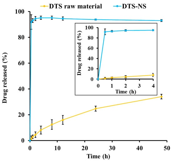 In vitro dissolution profile of DTS raw material and DTS-NS under sink condition. The sink condition was guaranteed by adding 2% w/v Cremophor EL to 10 mM sodium phosphate buffer (pH 7.4). Note: Data represent mean ± SD (n = 3).
