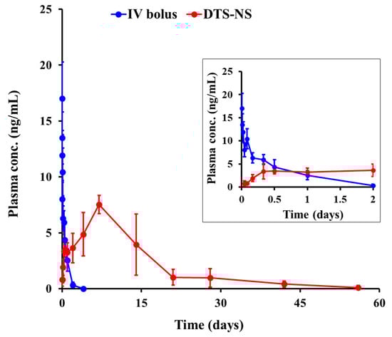 The plasma concentration–time profiles of DTS following IM injection (5 mg/kg as DTS) of DTS-NS and IV injection (0.2 mg/kg as DTS) of DTS solution in rats. Note: Data represent mean ± SD (n = 5).