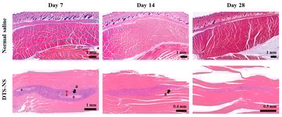 Histological examination of gastrocnemius muscles stained with hematoxylin and eosin (H&E) following intramuscular (IM) injection of negative control (normal saline) or DTS-NS in rats. Note: The depot formed by injection of DTS-NS is indicated by (*). Red double arrows indicate fibroblastic bands, and (a) denotes angiogenesis.
