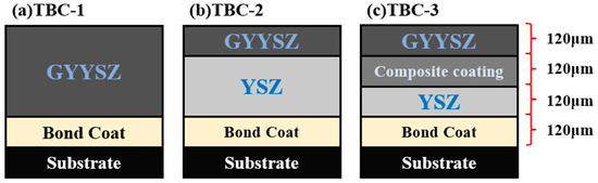 Figure 8 shows the cross-sectional images of three different TBCs prepared using APS technology. GYYSZ is deposited on the top layer of the TBC. TBC-1 serves as the control group without a transition layer. In TBC-2 and TBC-3, YSZ acts as the transition layer. This is because YSZ has a relatively high thermal expansion coefficient and is deposited between the GYYSZ and the bonding layer (NiCrAlY) to establish a thermal expansion coefficient transition. In TBC-3, a composite coating is sprayed between the YSZ and GYYSZ layers, further enhancing the transition in thermal expansion coefficients.