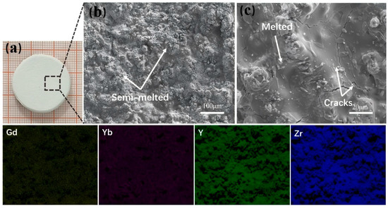 Figure 2 presents the macroscopic photograph, surface morphology, and the EDS elemental distribution map of the sprayed GYYSZ ceramic coating. In