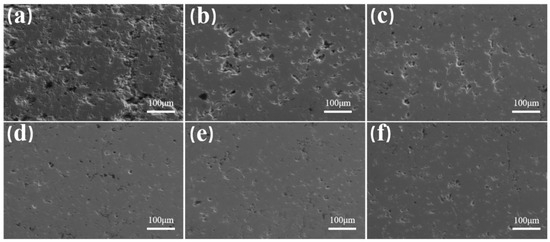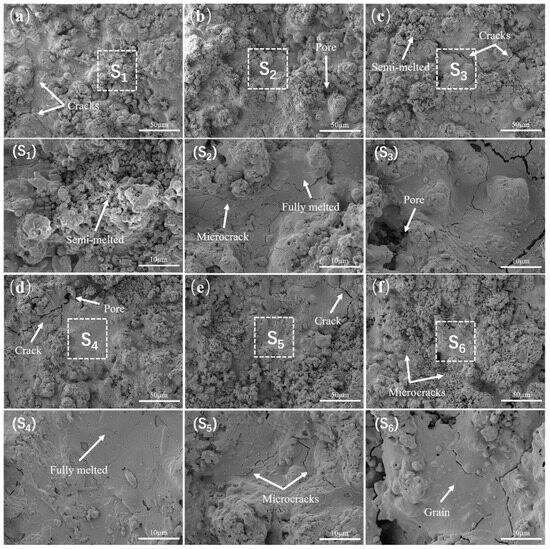 Figure 6a, the high-temperature sintered coatings exhibit significant porosity. In the cross-section, pores combine with microcracks, forming extensive porous regions. The interior of the pores has a rough texture, with some partially unmelted ceramic powder particles present. These pores result from the stacking of incompletely melted powder during the spraying process. The number of microcracks is relatively reduced, and the coating exhibits slight sintering, but the pore diameter has not significantly changed, in