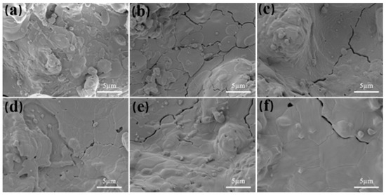 Figure 14b, numerous microcracks can be observed within the coating. The presence of shorter and higher-density microcracks can reduce the driving force for interface cracks. These microcracks can relieve the thermal mismatch stress at the interface, effectively alleviating interface stress, suppressing the formation and growth of transverse cracks, and thereby delaying coating spallation and enhancing thermal cycling life [