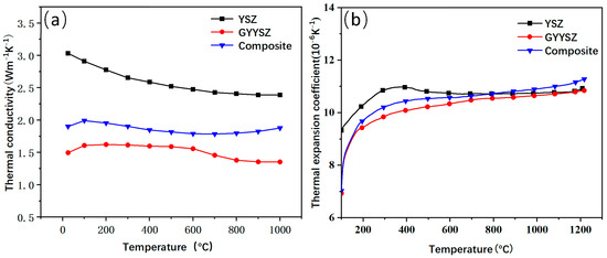 Figure 7 shows the curves of the thermal conductivity and the thermal expansion coefficient for YSZ, GYYSZ, and the composite material as a function of temperature. All three materials exhibit higher thermal conductivity at low temperatures and lower thermal conductivity at high temperatures, which aligns with the phonon scattering model. At elevated temperatures, increased phonon scattering reduces the average phonon mean free path, resulting in a decrease in the thermal conductivity of the samples. The thermal conductivity of YSZ is higher than that of GYYSZ and the composite material across the entire temperature range from room temperature to 1000 °C. YSZ’s thermal conductivity continuously decreases with increasing temperature, with a maximum value of 3.03 W·m