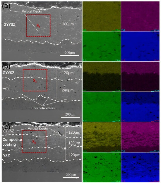 Figure 8b. The porosity of the as-sprayed YSZ layer is about 7.59%, and transverse microcracks are primarily distributed within the coating. The interface between the bonding layer and the ceramic layer is clearly defined, indicating good adhesion. However, it is difficult to distinguish the boundary between GYYSZ and YSZ in the SEM images due to their similar compositions and contrast. By performing an EDS elemental mapping on the selected region S2, the boundary between the coatings can be observed, showing that GYYSZ contains higher concentrations of Gd and Yb, while YSZ has a higher Zr content.