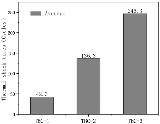 Figure 9 illustrates the average thermal shock times of the three types of TBCs. The average thermal shock time is the shortest for TBC-1, at just 42.3 cycles. In contrast, TBC-2 shows a significant increase in thermal shock time, reaching an average of 136.3 cycles, which is 3.2 times that of TBC-1. This indicates that the dual-ceramic layer structure offers significantly better thermal shock resistance. Due to the low thermal expansion coefficient of GYYSZ, thermal mismatch occurs between the ceramic layer and the bonding layer in TBC-1. Depositing a layer of YSZ between GYYSZ and the bonding layer, the higher thermal expansion coefficient of YSZ at mid to low temperatures generates less thermal stress during thermal cycling compared to TBC-1, thereby extending the thermal cycling times of the coating. The average thermal shock time of TBC-3 is 246.3 cycles, nearly six times that of TBC-1 and 80% more than TBC-2. This indicates that adding a transition layer can significantly enhance the thermal shock lifespan of the TBC. The thermal shock test results show that modifying the compositional gradient of the TBC structure can enhance its thermal shock lifespan. Furthermore, adding a transition layer in coatings prone to thermal mismatch can create a gradient in thermal expansion coefficients, significantly improving thermal shock resistance.
