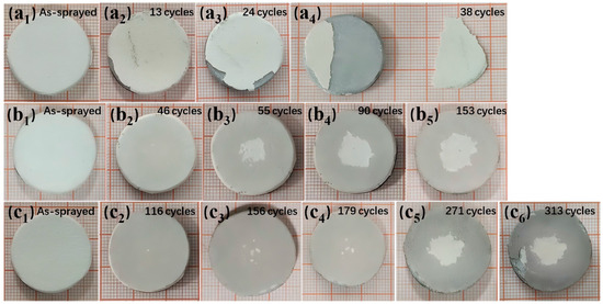 Figure 10 shows photographs of the three types of TBCs during thermal cycling experiments at different times of cycles, focusing on four stages: at the as-sprayed stage, at initial spalling, during ongoing spalling, and at thermal shock failure. The TBC failure mode is mainly in the form of ceramic layer peeling. TBC-1 exhibits large-scale spalling of the ceramic layer; TBC-2 shows failure in the center area with a failure area reaching 20%; TBC-3 demonstrates spalling failures at both the edges and the center of the ceramic layer. As shown in