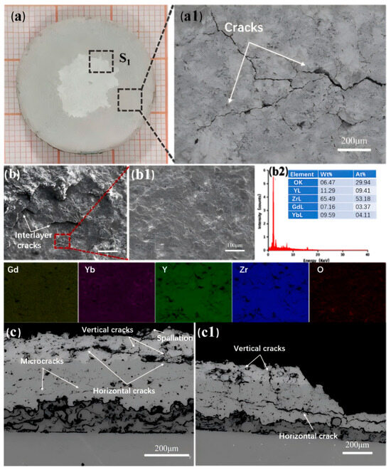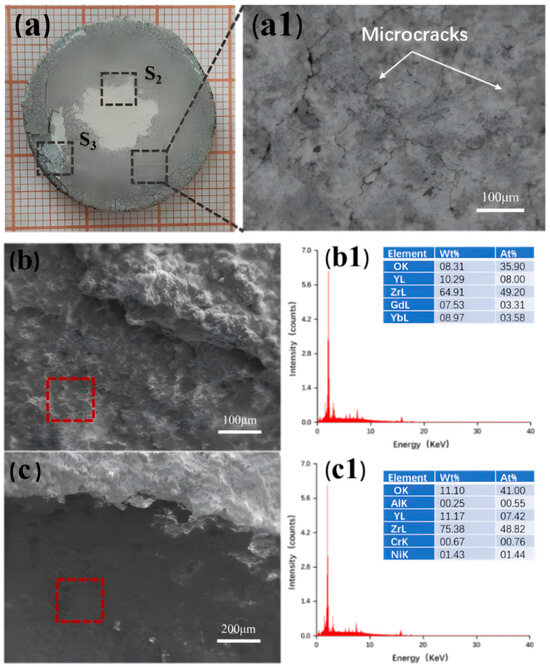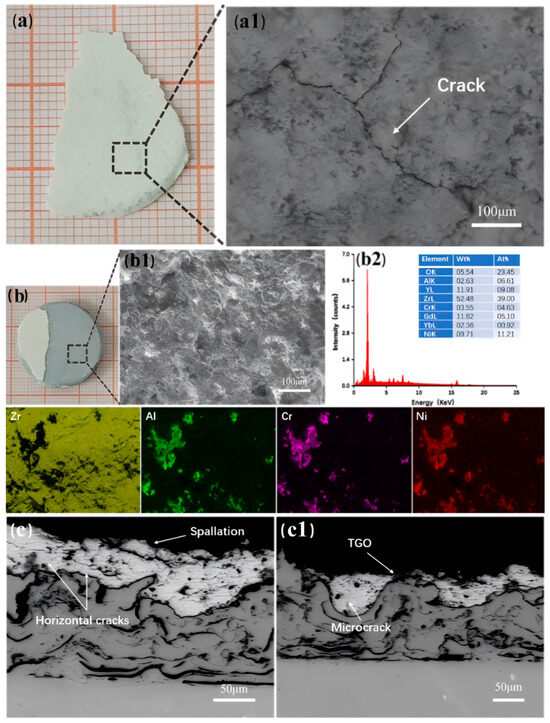 Figure 11(a1), the surface of the fallen layer exhibits cracks. This occurs during heating, where the high thermal expansion coefficient of the bonding layer exerts compressive stress on the ceramic layer, while during cooling, the ceramic layer experiences tensile stress. In the thermal shock cycling experiment, the coating experiences a repetitive cycle of tensile and compressive stresses, which induces the initiation, and propagation of microcracks. After the ceramic layer of TBC-1 delaminates, the exposed area appears gray, indicating that the delamination occurs near the interface between GYYSZ and the bonding layer. The EDS elemental mapping results for the failed regions are shown in