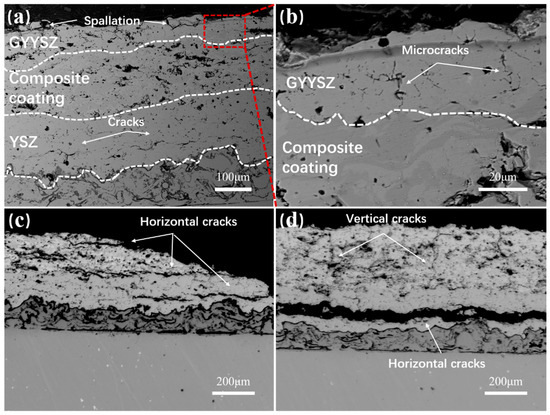 Figure 14a, the thickness of the GYYSZ layer is reduced, and block-like ceramics are observed on the layer, indicating that the spalling occurs within the GYYSZ top layer. There are no obvious longitudinal cracks observed within the composite layer and the YSZ layer, and only minor transverse cracks are present at the interface between NiCrAlY and YSZ. This indicates that optimizing the structure of the thermal barrier coating can significantly reduce the thermal mismatch stress between the components. In the competition between interface cracks and surface cracks, the expansion of surface cracks dominates, leading to the failure and detachment of the coating. In the cross-sectional morphology of the GYYSZ layer, as shown in