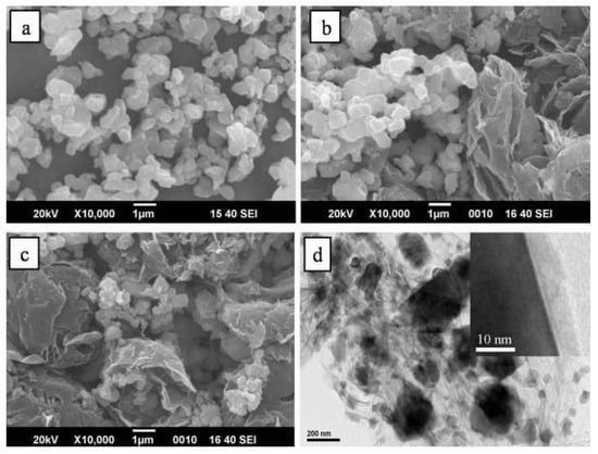 SEM images of (a) LTO, (b) LTO/graphene, and (c) C-LTO/graphene and TEM image (d) of C-LTO/graphene [36].