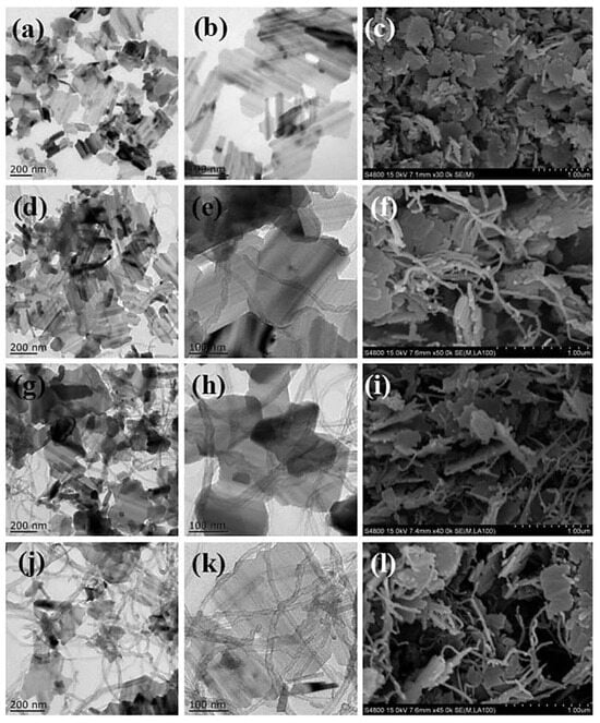 TEM and SEM images of (a–c) LTO NSs and LTO NS/CNT composites with (d–f) 5%, (g–i) 7.5%, and (j–l) 10% CNTs [8].
