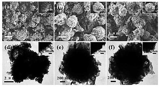 On the other hand, Zhang et al. developed a composite material consisting of Li4Ti5O12 microspheres and reduced graphene oxide (rGO) [10]. Their approach involved the hydrolysis of titanium butoxide, followed by a 36h hydrothermal reaction at 180 °C using a TiO2 precursor, GO, and LiOH. The resulting composite was then heat-treated at 600 °C in an Ar atmosphere. Specifically, TiO₂ powder was synthesized by hydrolyzing tetrabutylortho-titanate (TBOT). A solution of 2 mL TBOT in 8 mL ethanol was slowly added to a solution of PVP (0.02% w/w) in 100 mL ethanol with 1 mL water. After stirring, the mixture underwent hydrothermal treatment at 80 °C for 2 h. The resulting TiO2 precipitate obtained was washed, air-dried, and mixed with LiOH solution, maintaining a Ti-to-Li molar ratio of 5:4.5. This mixture was subjected to a 36h hydrothermal treatment at 180 °C, followed by calcination at 600 °C under an Ar atmosphere to obtain spinel LTO. GO was prepared by the modified Hummers method and added to the TiO2-LiOH mixture prior to hydrothermal treatment, with 1.0 wt% and 3.0 wt% being incorporated into the GO/LTO composites. Figure 8 shows the SEM and TEM images of the microstructures of the original LTO and LTO particles coated with 1.0 wt% and 3.0 wt% rGO [10]. The original LTO particles exhibit an irregular nanoplatelet shape with a non-uniform size distribution (Figure 8a). In contrast, the LTO particles with 1.0 wt% rGO and 3.0 wt% rGO coatings exhibit a spherical morphology (Figure 8b,c). The TEM images in Figure 8e,ffurther reveal that the LTO particles with both rGO coatings maintain a similar microstructure, with an almost spherical shape and an approximate diameter of 1.6 μm. Moreover, the surface of the LTO particles with 3.0 wt% rGO appears relatively compact and uniform [10], which could potentially enhance the kinetics of lithium ions.