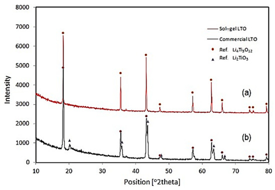 XRD pattern from (a) sol–gel and (b) commercial LTO [40].