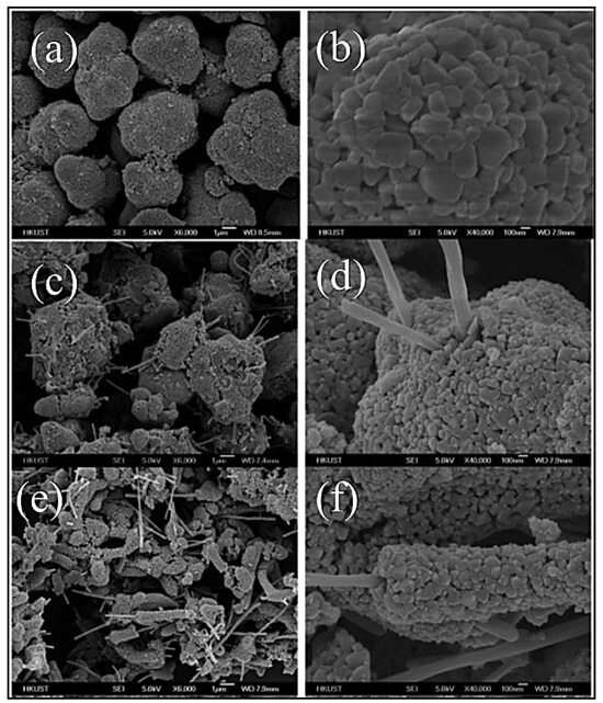 In a study conducted in 2012, Zhang et al. developed a composite powder of LTO and carbon nanofibers (CNFs) using the sol–gel method [9]. The base material was pure LTO powder, specifically Li3.9Sn0.1Ti5O12 with a minor Sn2⁺ impurity, intended for use in LIBs. The CNFs, ranging from 10 to 20 mm in length and averaging 150 nm in diameter, were dispersed in ethanol using ultrasound. Titanium isopropoxide was then added to the solution, followed by dehydrated lithium acetate and tin (II) chloride, all mixed under vigorous stirring. To account for lithium evaporation during high-temperature synthesis, an excess of 10 mol % of lithium was added. The resulting gel was dried at 60 °C for 24 h and calcined at 800°C for 12 h in a nitrogen atmosphere to produce LTO-CNF composite powders. Two variants were prepared: LTO-CNF-1 (5.9% CNFs) and LTO-CNF-2 (11.1% CNFs). For comparison, a batch of LTO powder was synthesized without CNFs [9]. Figure 8 displays SEM images that highlight the distinct characteristics of the composite powders based on the CNF content. Initially, the pure LTO particles exhibit spherical secondary structures formed from primary particles (ranging from 100 to 500 nm), with small pores visible (Figure 11a,b). Upon adding CNFs, the morphology of the secondary particles changes. At 5.0% w/w CNFs, the secondary particles acquire an irregular, sea urchin-like appearance, with multiple CNF rods penetrating them (Figure 11c,d). With a 10% w/w CNF content, the particles elongate into a corn-shaped structure, with CNFs embedded longitudinally (Figure 11e,f). These morphological changes are attributed to the self-assembly of primary LTO particles around the CNFs during calcination, which limits primary particle growth and inhibits further growth [9]. This leads to the conclusion that by adding conductive materials such as CNFs, a larger active surface area is achieved, expected to enhance the electrochemical performance due to the better ion mobility in the material structure.