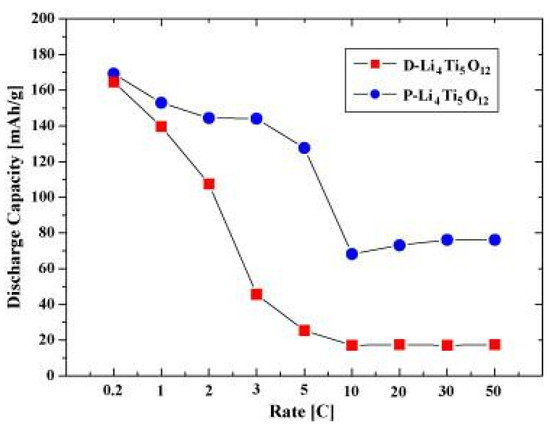Discharge capacities of the dense LTO (D-Li4Ti5O12) and porous LTO(P-Li4Ti5O12) as a function of discharge rate at a constant charge rate of 0.2C (cut-off voltages: 0.5–2.5 V) [35].