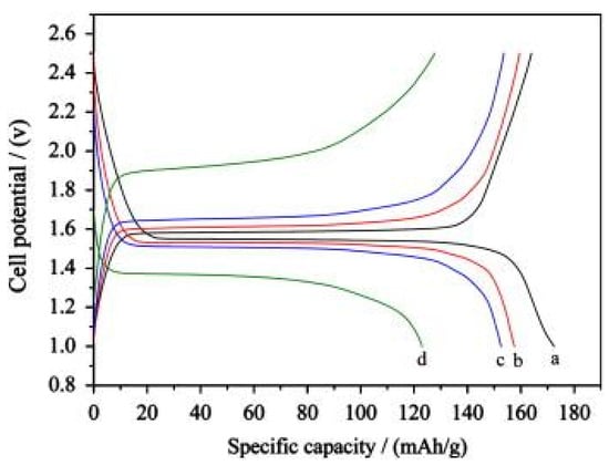 Charge/discharge curves of Li4Ti5O12 for (a) 0.1C, (b) 0.5C, (c) 1.0C, and (d) 5C [37].