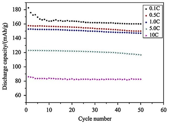 This structure significantly increases the specific surface area, facilitating enhanced transport channels of lithium ions. Consequently, the interface between the electrolyte and the electrode material is improved, reducing irreversible capacity loss and enhancing electrochemical properties such as the specific capacitance and cycling performance. Cycle performance data, shown in Figure 14, highlight the excellent capacitance retention, with over 92% after 50 cycles at 0.1C and maintaining high retention rates at 0.5C and 1C [37].