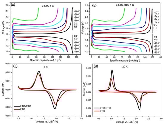 Charge/discharge curves of the LTO (a) and LTO–RTO (b) electrodes; CV curves of the LTO–RTO and LTO electrodes at 0 °C (c) and −20 °C (d) [44].
