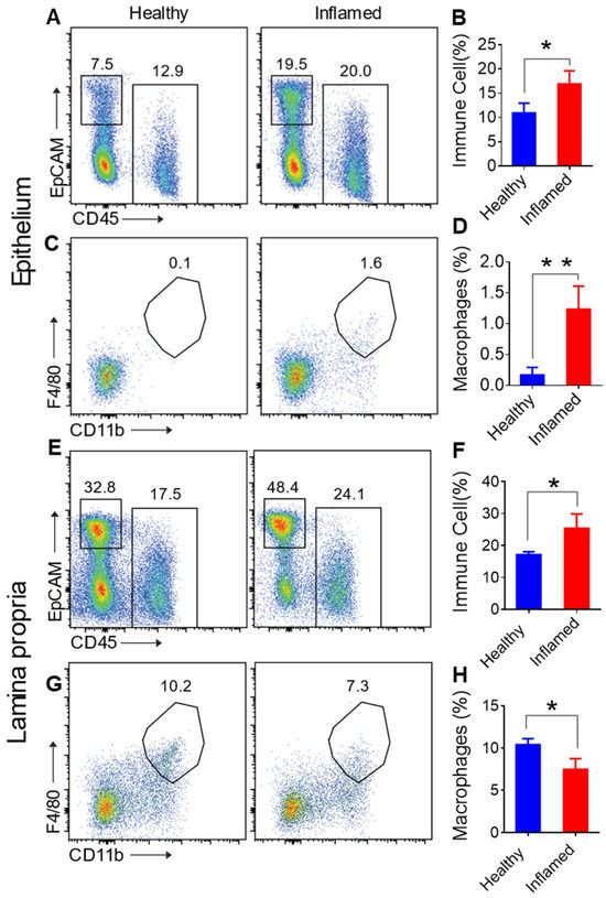 3.3.1. Inflammation Reduces Epithelial Cells and Increases Immune Cells in the Colon Mucosa