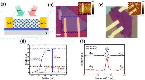 (a) Schematic of the MoTe2-based photodetector apparatus exposed to light at 520 and 1064 nm. The device comprises MoTe2 layers on top of a SiO2/Si substrate coupled with Au/Cr electrodes. (b) Microscopic view of a thick MoTe2 photodetector through Au/Cr electrodes. (c) Microscopic view of thin MoTe2 device through Au and Cr electrodes. (d) AFM thickness profile depicting thick and thin MoTe2 flakes, corresponding to inset in (b,c), with RMS of 6.34 nm and 2.32 nm, respectively. (e) Raman spectra of thick and thin MoTe2 flakes on SiO2/Si substrate for the excitation wavelengths of 532 nm.