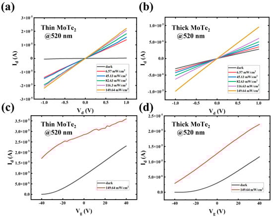 The output and transfer characteristics were also obtained under different illumination powers, as shown in Figure 2a–d. It indicates a rise in photocurrent with increasing illumination power. The surge in photocurrent with increasing light intensity suggests that the photodetector demonstrates a significant photoconductive effect, which is common in semiconductor materials. The linearity of Id-Vd characteristic curves shows an outstanding ohmic contact among the MoTe2 to the Cr electrodes [9]. When exposed to light, the increased current under illumination is due to the production of electron-hole pairs in the MoTe2 thin film. As the light intensity increases, more charge carriers are created, leading to higher currents. However, the photocurrent variation in a thin-based MoTe2 photodetector is more significant than that of a thick-based photodetector. This could be due to better light absorption and charge transport properties in the thinner MoTe2 layer, which can trap and generate more charge carriers than thicker layers. Under dark conditions, the current remains near zero, confirming a low dark current compared to thick-based MoTe2, as illustrated in Figure 2a–c, which displays the transfer characteristics (Id versus gate voltage Vg) of the thin MoTe2 device under dark conditions and illumination (149.64 mW/cm2). Under illumination, the photocurrent increases significantly across the entire range of gate voltages compared to the dark condition, which shows n-type semiconductors. This increase in photocurrent with light results from the photoexcitation of electrons, contributing to the rise in the total current flowing through the device. Similarly, Figure 2c,d shows the transfer characteristics for the thick MoTe2 device under dark and illuminated conditions, indicating that drain current increases with changing Vg, proving that thick-based MoTe2 is an n-type semiconductor. As in the thick device, the thin MoTe2 device shows an increase in photocurrent under light compared to dark conditions. However, there is slight nonlinearity in the drain current of thin-based MoTe2 as light illumination increases, which is because there should be little trap in the thin MoTe2 layer or interface between MoTe2 and gate dielectric. However, the overall current values under both dark and light conditions are lower in the thick device compared to the thin one at 520 nm. This suggests lower light absorption and fewer photo-generated carriers in the thick MoTe2 layer. The thin MoTe2-based photodetector outperforms the thick MoTe2 device in terms of photocurrent generation and overall responsiveness to light. The elevated ratio of surface area to volume enhances light absorption and charge transport at 520 nm. It reduces the influence of surface states, making the thin MoTe2 device more suitable for applications requiring high photocurrent under light exposure.