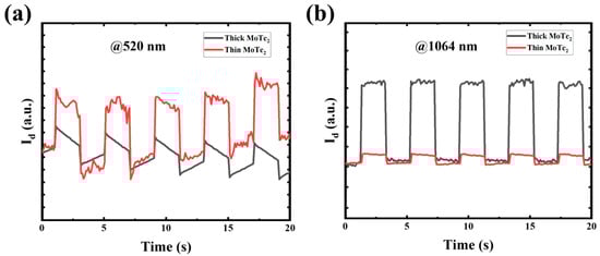 Photoresponses of thick and thin MoTe2-based devices. (a) Time-dependent photoresponses of thick and thin MoTe2 at Vd = +1 V and Vg = 0 V under 520 nm light illumination. (b) Time-dependent photoresponses of thick and thin MoTe2 at Vd = +1 V and Vg = 0 V under 1064 nm light illumination.