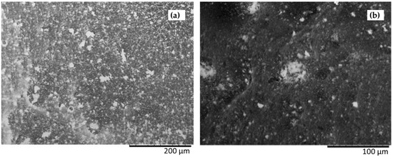 The choice of a synthesis of the Ag nanorods that does not involve the use of a surfactant but instead of PVP as a capping agent to favour the preferential growth of the particles along one direction, as in the procedure of Mahmoud [14] described in Section 2.2.3, led to the acquisition of much more promising substrates after the deposition on the glass support. An appreciable distribution of the aggregates can be in fact observed in the SEM images of the substrates prepared, for example, via deposition of the colloid concentrated both by a factor of 50 or 5 (Figure 2). The glass surface appears to be rather homogeneously covered by Ag, as shown, for example, in Figure S4 for the substrate obtained via deposition of the colloid concentrated by a factor of 10. Of course, the coating will be more or less dense, depending on the concentration of the deposited colloid.