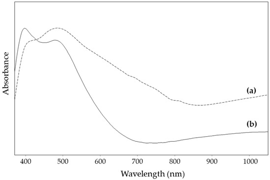 UV-visible spectra were recorded in the 400–1000 nm spectral range using a Jasco UV/VIS/NIR V-570 spectrometer (Jasco Europe, Cremella, LC, Italy), equipped with both a photomultiplier and a PbS detector. The instrument enables measurements in transmission mode and, when fitted with an integrating sphere, in reflection mode.