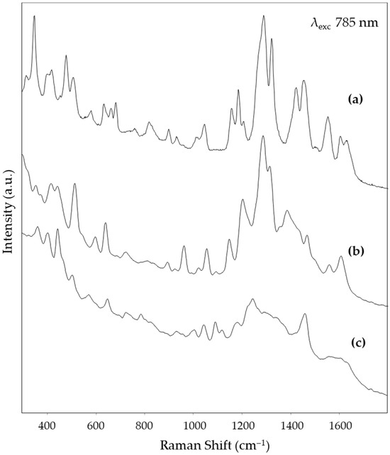 SERS spectra (λexc 785 nm) obtained from (a) alizarin solution, (b) purpurin solution, and (c) lac dye solution.