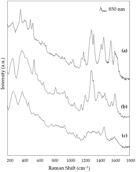 Figure 4, Figure 5 and Figure 6 show, respectively, the SERS spectra obtained for the reference solutions of alizarin, purpurin, and lac dye on solid substrates prepared from the Mahmoud nanorod colloid, using the three excitation wavelengths tested in the present work, i.e., 532 nm in the visible region and 785 and 850 nm in the NIR one. The peak wavenumbers are reported in Table 1. For the visible excitation, a substrate derived from the deposition of a colloid concentrated with a factor of 20 was used, while for the longer wavelengths, a concentration factor of 50 gave the best results. It is worth noting that for both excitation at 532 and 785 nm an excellent signal-to-noise (S/N) ratio was obtained, confirming the very good SERS activity of this substrate. In fact, while in the green region of the visible spectrum, the reference dyes examined also exploit the Raman resonance effect, in the NIR region only the enhancement due to the SERS effect is active. A slightly worse S/N ratio is observed for the SERS spectra excited at 850 nm, but the characteristic bands of the three dyes are still well recognizable. The variation in the spectral pattern of each dye, depending on the excitation wavelength, is consistent with the fact that, as discussed above, the resonance effect only contributes to the spectrum excited with green radiation. The observed variations agree with those reported in the literature, respectively, for alizarin [16] and laccaic acid [17].
