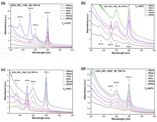 The optical absorption spectrum demonstrates a shift in absorption peaks with the increasing thickness of the NPLs. If the sample contains multiple populations of NPLs with different thicknesses, the resulting spectrum resembles a linear combination of discrete elements []. At the initial stage of the synthesis, an additional absorption peak appears at 387 and 428 nm (Figure 2), which is consistently observed across all samples and corresponds to the early stage of nucleation. At the initial phase of injection, supersaturation of the concentration occurs, stimulating nucleation, which leads to the initial formation of thin nanoplatelets [], which subsequently dissolve and serve as a building material for the growth of thicker NPLs of 3.5 ML (Figure 2a–c). According to TEM images, other NPL populations are not observed in the samples. Thus, the concentration at low temperatures is excessive, whereas, at higher temperatures, it becomes suitable for the growth of NPLs. These assumptions align with the findings of the author of [], who indicated that, according to TEM data, new populations or smaller-sized nanoparticles were not detected during the early stages of synthesis. Five minutes after injection, as the reaction time increases, the initial peaks begin to disappear, and the two main peaks (450 and 500 nm), corresponding to the growth of the nanoplatelets, become more clear. It suggests that the thin nanoplatelets begin to aggregate into larger, thicker nanoplatelets.