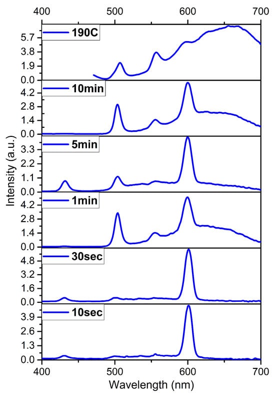 A sample with the best stoichiometry was identified at 190 °C. The change in the luminescence spectrum at different synthesis times at 190 °C is shown in Figure 3.