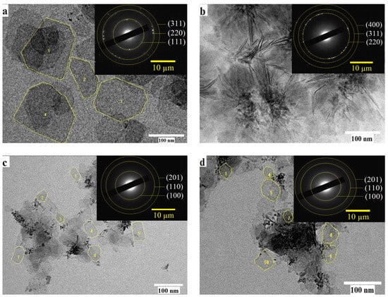 Distinct rectangular NPLs are observed, retaining their two-dimensional shape with minimal edge degradation (Figure 4). Selected area electron diffraction (SAED) for CdTe NPLs demonstrated a cubic zinc blende structure (Figure 4, inset in a, b). (111), (220) and (311) at temperature 170 °C and (220), (311), (400) at 180 °C []. Table 1 shows the data of SAED with interplanar distances and Miller indices for NPL CdTe obtained using TEM.