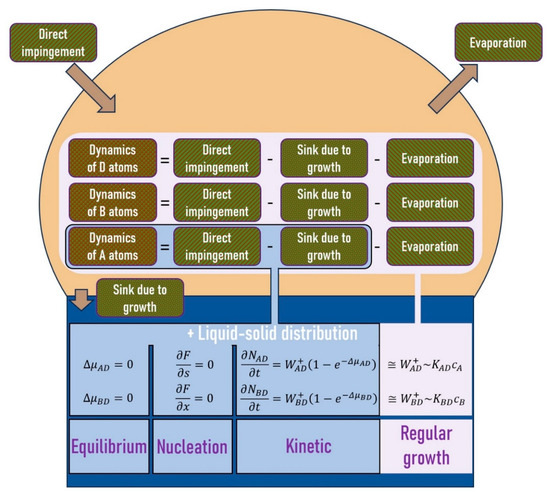 The majority of existing models are based on a combination of the material transport of atoms into the droplet and the specific regime of atom incorporation into the solid phase. The dynamics of atoms in the catalyst droplet are governed by the competing processes of the incorporation of atoms into the nanowire, evapouration from the droplet, and atomic influx due to direct impingement, diffusion, and re-emission. Typically, all three influxes are combined in one arrival rate of a given element. Depending on the regime of the incorporation of atoms (or pairs) from a liquid to a solid, the models describing the growth of nanowire heterostructures can be categorized into four types: equilibrium, nucleation-limited, kinetic, and regular growth models (Figure 2). Strictly speaking, the last one is a particular case of the kinetic model under high enough supersaturations of liquid with respect to a ternary solid. In this case, one can neglect the rejected fluxes because they are much smaller than the diffusion fluxes into the island. The nanowire elongation rate depends on the concentrations of A, B, and D elements and changes over time. As a result, one should solve the system of equations describing the evolution of the number of atoms that constitute the nanowire. This corresponds to the large pink box in Figure 2. However, the assumption of time-independent nanowire growth rate allows one to simplify the analysis and consider only the dynamics of A atoms (corresponds to the small blue box in Figure 2). In modelling the growth of nanowire heterostructures based on a group III interchange, the evapouration of A and B atoms from the droplet can often be neglected.