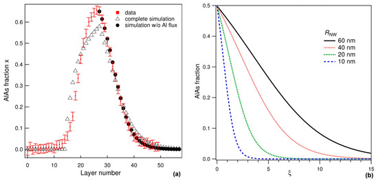 This equation describes the interfacial profile in the transition from AlGaAs to GaAs. The assumption means that the flux of B atoms (Ga) is used to keep the droplet volume constant. As seen from Figure 3a, the AlxGa1−xAs/GaAs interface is effectively reproduced within the equilibrium model when the Al flux equals zero.