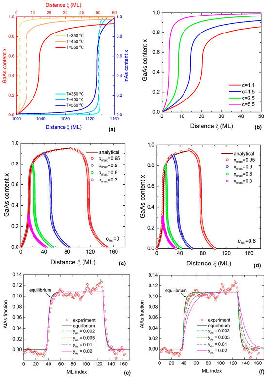 (a) The compositional profiles across InAs/GaAs and GaAs/InAs heterostructures in self-catalysed nanowires, calculated at different temperatures and fixed values of , , and [165]. Reproduced from Ref. [165] with permission from the Royal Society of Chemistry (2022). (b) The compositional profiles across InAs/GaAs heterostructures in Au-catalysed nanowires, calculated at different values and fixed values of , , , and [165]. Reproduced from Ref. [165] with permission from the Royal Society of Chemistry (2022). (c) The compositional profiles across InAs/In1−xGaxAs/InAs heterostructures, calculated for different Au concentrations of (c) and (d) at fixed values of , , and [165]. Solid lines in (a,b) and symbols in Figure 4c,d correspond to the numerical solution of Equation (21). Solid lines in (c,d) correspond to the analytical solution obtained from Equation (26). Reproduced from Ref. [165] with permission from the Royal Society of Chemistry (2022). The experimental compositional profiles across double GaAs/AlxGa1−xAs/GaAs heterostructures grown by solid-source MBE between 590 and 610 °C (symbols), fitted by the nucleation model with composition-independent (e) (based on Equation (18)) and composition-dependent (f) (based on Equation (28)) surface energies of the critical nucleus (lines) [195]. Reprinted (adapted) with permission from [195]. Copyright © 2017 American Chemical Society.