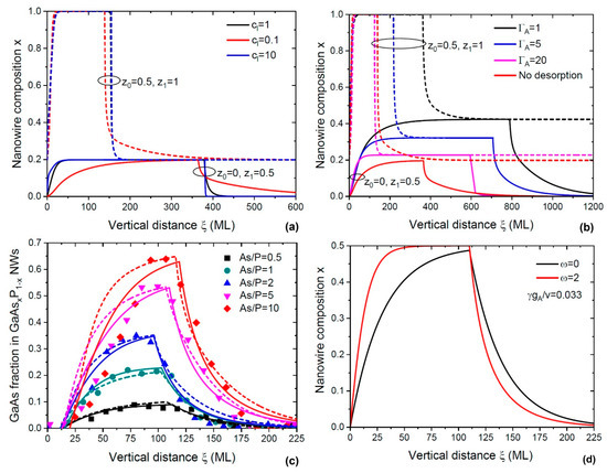 (a) The compositional profiles across double nanowire heterostructures with different values and stationary fractions of group V atom A in the vapour shown in the legend [196]. Lines correspond to the simulation of the compositional profile without desorption (Equation (64)). Reproduced from Ref. [196] with permission from MDPI (2024). (b) The compositional profiles across double nanowire heterostructures with different values and stationary fractions of group V atoms A in vapour shown in the legend [196]. Reproduced from Ref. [196] with permission from MDPI (2024). Solid lines in (a,b) correspond to the case when , ; dashed lines correspond to the case when , . (c) Experimental (symbols) [197] compositional profile across the GaP/GaAsxP1−x/GaP nanowire heterostructures with different stationary compositions , grown using Ga-catalysed MBE at 630 °C under different As/P ratios. Dashed lines correspond to the simulation of the compositional profile without desorption [196]. Solid lines correspond to complete simulation. Reproduced from Ref. [196] with permission from MDPI (2024). (d) The compositional profiles across double nanowire heterostructures with (red line obtained at ) and without (black line obtained at ) desorption of group V elements given by Equation (66) [196]. Reproduced from Ref. [196] with permission from MDPI (2024).