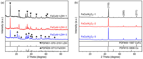 (a) XRD patterns of FeCoAl-LDH-x and (b) XRD patterns of FeCo/Al2O3-x.