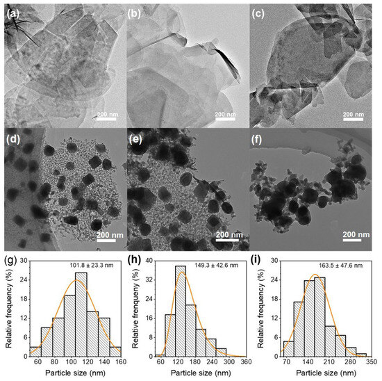 TEM images of (a–c) FeCoAl-LDH-x (x = 1–3). (d–f) TEM images of FeCo/Al2O3-x (x = 1–3). (g–i) Statistical distribution graphs of the particle size of FeCo/Al2O3-x (x = 1–3).