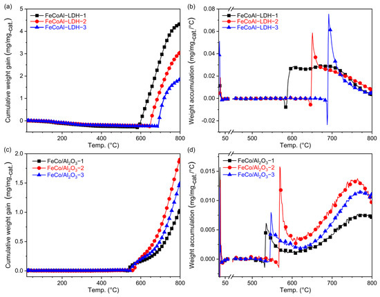 A TG analysis was conducted to monitor the change in mass with temperature during the in situ CMD reaction. The heating process started from 20 °C and reached 800 °C at a heating rate of 5 °C, with a mixed flow of 20 sccm CH4 and 20 sccm Ar. As shown in Figure 3a, the mass of the reactants exhibited a slight decrease before reaching 600 °C, which corresponds to the reduction phase of FeCoAl-LDH-x. After reaching 600 °C, the mass gradually started to increase, indicating carbon accumulation. The masses of FeCoAl-LDH-1, -2, and -3 began to increase at about 588 °C, 648 °C, and 696 °C, respectively. The variation in temperature at which the catalyst mass increases is attributed to the difficulty of reducing Fe. The differing Fe content in the catalysts means that those with higher Fe concentrations require a higher temperature range to be fully reduced before catalyzing the CMD reaction and accumulating carbon materials, leading to an increase in weight. With increasing temperature, the mass of the carbon product continued to accumulate until the end of the heating process. The normalized data revealed that the carbon accumulation for FeCoAl-LDH-1, -2, and -3 reached 4.33 mg/mg-cat, 3.05 mg/mg-cat, and 1.84 mg/mg-cat, respectively. These results indicate that an increase in Fe content leads to a decrease in carbon accumulation, as higher Fe loadings reduce the catalyst’s surface area [31].