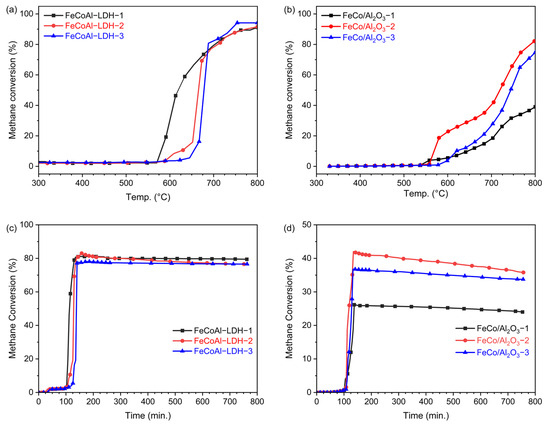 The relationship between methane conversion and temperature in the TPSR test at 5 °C/min to 800 °C for (a) FeCoAl-LDH-x and (b) FeCo/Al2O3-x, and the relationship between methane conversion and temperature in the TOS test at 5 °C/min to 700 °C for insulation of (c) FeCoAl-LDH-x and (d) FeCo/Al2O3-x.