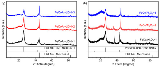 XRD patterns of methane decomposition reaction products catalyzed by (a) FeCoAl-LDH-x and (b) FeCo/Al2O3-x.