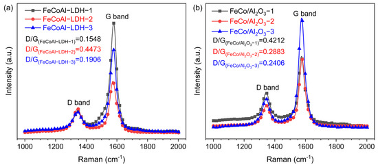 Raman spectra of (a) spent FeCoAl-LDHs-x (x = 1–3) and (b) FeCo/Al2O3-x (x = 1–3) catalysts after TG.