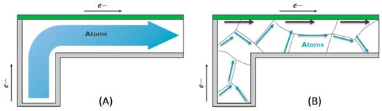 10], where the diffusivity value along the void surface was considered to vary depending on its interaction with the grain boundaries and other interfaces, causing a variation in the atomic flux. Subsequently, the normal velocity of the void’s surface was estimated using the normal component of the volumetric atomic flux and the divergence of its tangential component. An attempt to include microstructure in both stress evolution and void dynamics was shown separately by Kteyan and Sukharev [