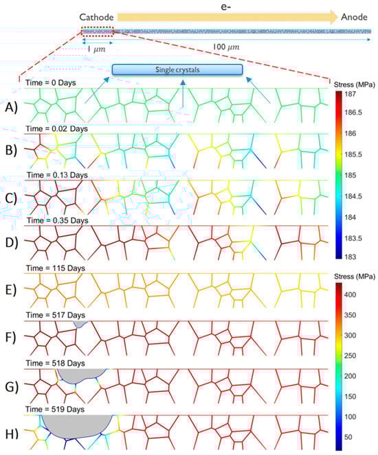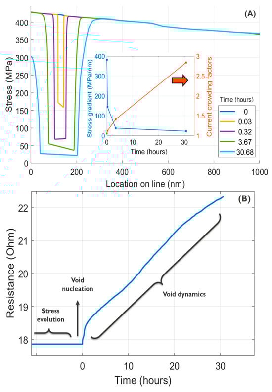 Figure 6. At the onset (time 0), denoted as the initiation of current flow through the interconnect, a uniform initial stress of 185 MPa was assumed, as estimated in our dedicated thermal-mechanical study [