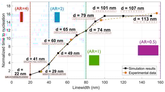 The consistent trend of pronounced reliance on linewidth for high aspect ratio lines, followed by a plateauing effect, was evident across all line heights. However, due to the variation in the value of line width at which aspect ratio 1 was reached for each line height, the point of saturation varied accordingly, where doubling the line height for a fixed large line width (i.e., lying in the saturation region) was found to give about a 2.5× increase in the value of nucleation time saturation. However, for a fixed small line width (i.e., lying in the aspect ratio 1 and above region), a reduction in time to nucleation was noted as the line height increased, even if the minimum cross-sectional dimension dictating the average grain size was the fixed line width. This influence gradually reached a plateau with a further increase in line height. This phenomenon can be attributed to the probability of encountering a single crystal region or a polycrystalline region along the length of the line, quantified by the “p” factor [