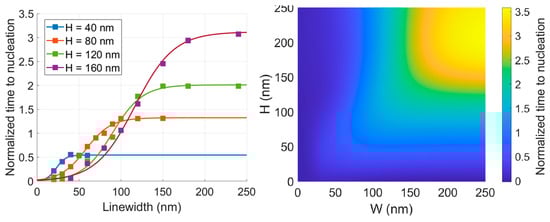 Figure 9, left hand side plot) and using 2D interpolation, the time to nucleation was estimated for each combination of line height and width, extending up to and including 250 nm (see