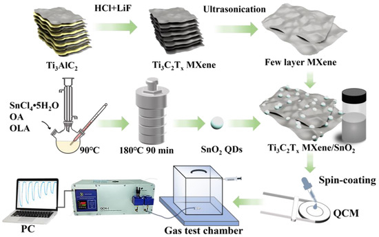 All reagents were employed in their original unpurified state. The Ti3AlC2 MAX phase powder (99.99%, CAS: 196506-01-1) and LiF (99%, CAS: 7789-24-4) were procured from Jilin 11th Technology Co. Ltd. (Jilin, China) and Macklin Biochemical Technology Co., Ltd. (Shanghai, China). SnCl4·5H2O (99%, CAS: 10026-06-9), oleic acid (OA, CAS: 112-80-1), and oleyl amine (OLA, CAS: 112-90-3) were procured from Shanghai Aladdin Biochemical Technology Co., Ltd. (Shanghai, China). The HCl (CAS: 7647-01-0), toluene (CAS: 108-88-3), and ethanol (CAS: 64-17-5) were provided by Sinopharm Chemical Reagent Co., Ltd. (Shanghai, China). The QCM devices (frequency is 8 MHz) were bought from Shenzhen Jingyuanxing Electronics Co., Ltd., China, which consisted of an AT-cut quartz substrate and silver electrodes.